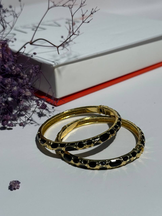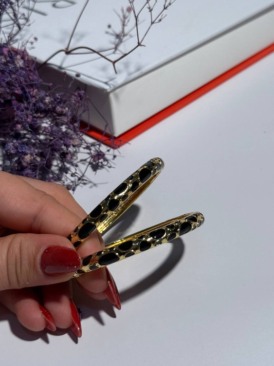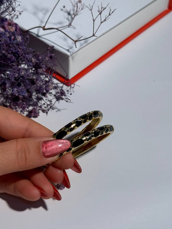در این مدل، سطح دستبند با لعاب مینا پوشانده شده و خالهای سیاه بهصورت منظم یا هنرمندانه روی آن اجرا میشوند. تضاد رنگی بین زمینه روشن و خالهای تیره، باعث برجسته شدن طرح و افزایش جذابیت بصری آن میشود. هر قطعه با دقت و ظرافت دستساز بوده و همین موضوع باعث میشود هر دستبند ویژگی منحصربهفرد خود را داشته باشد.
